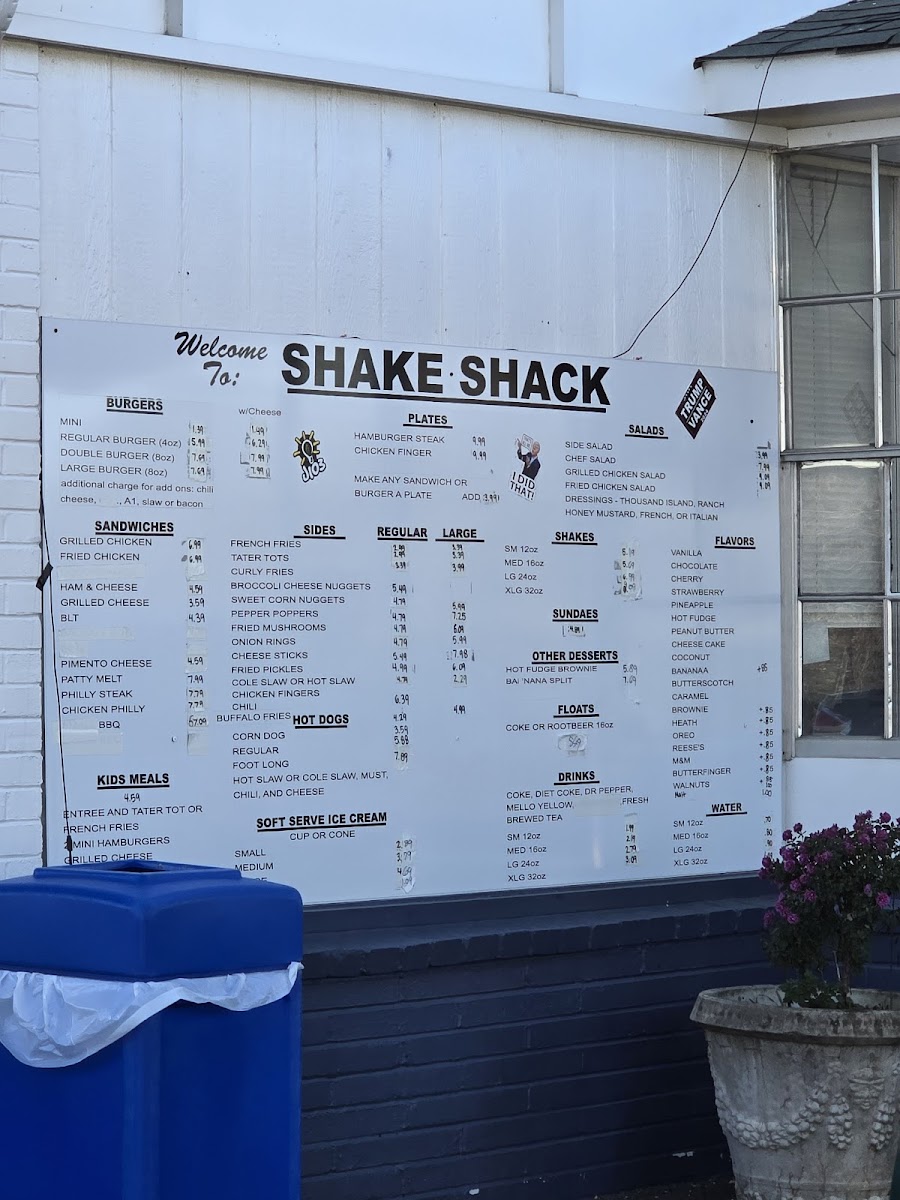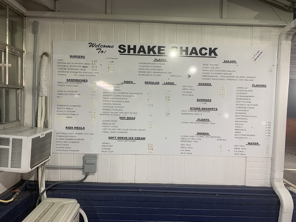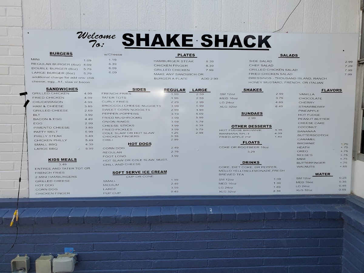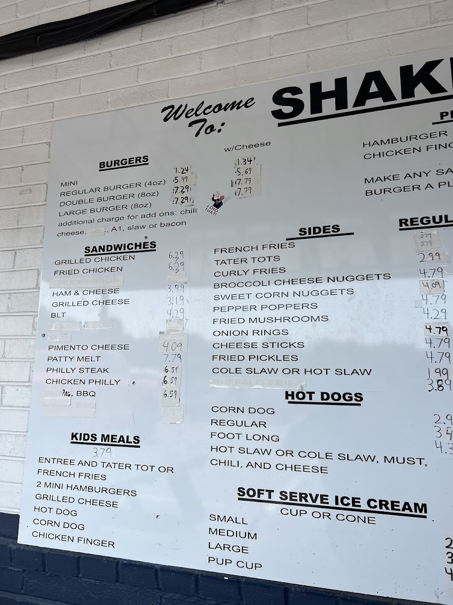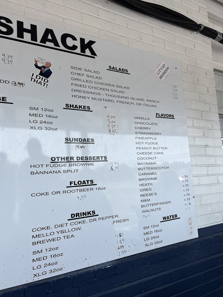 The menu offers a variety of options primarily centered around hamburger and fast food items, complemented by ice cream treats. Food selections include classic and specialty burgers such as cheeseburgers and the Texas Toast BLT Pimento Cheese Burger, along with sides like tater tots and fries. Sandwich options also include a fish sandwich.