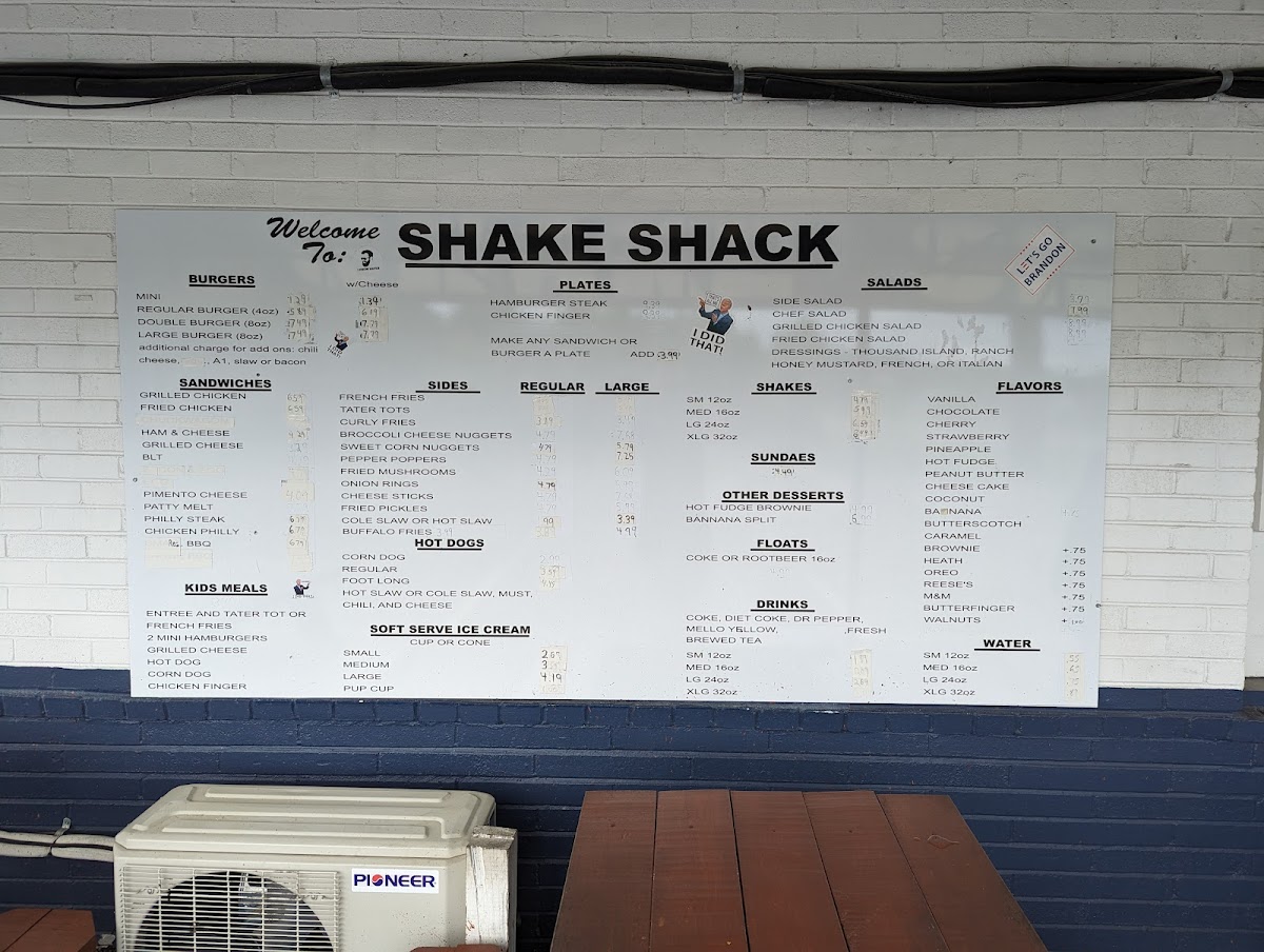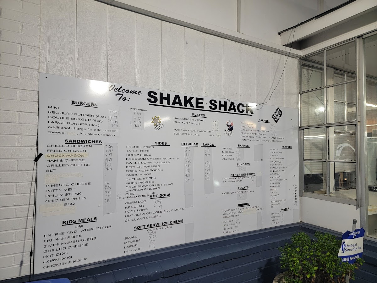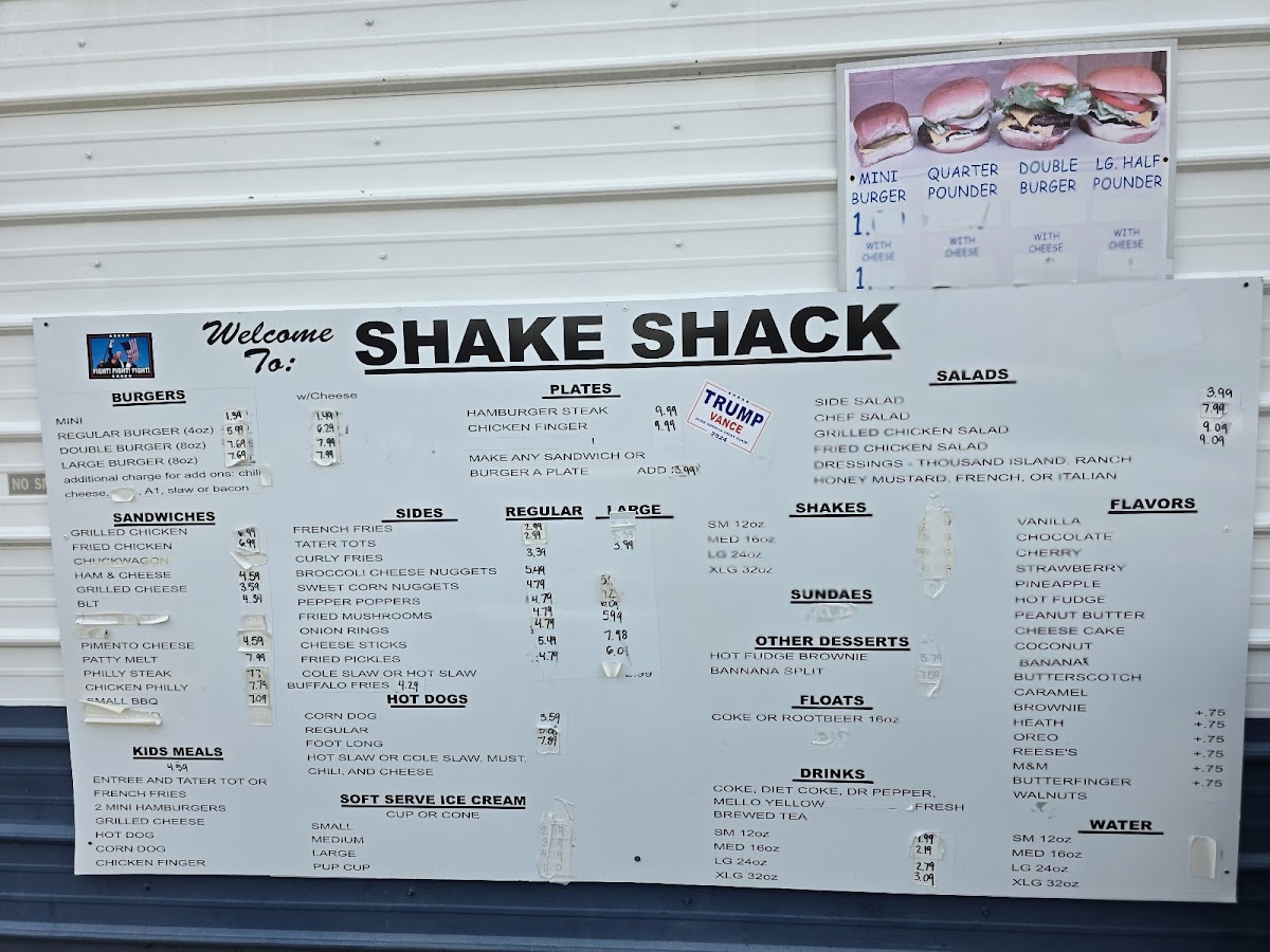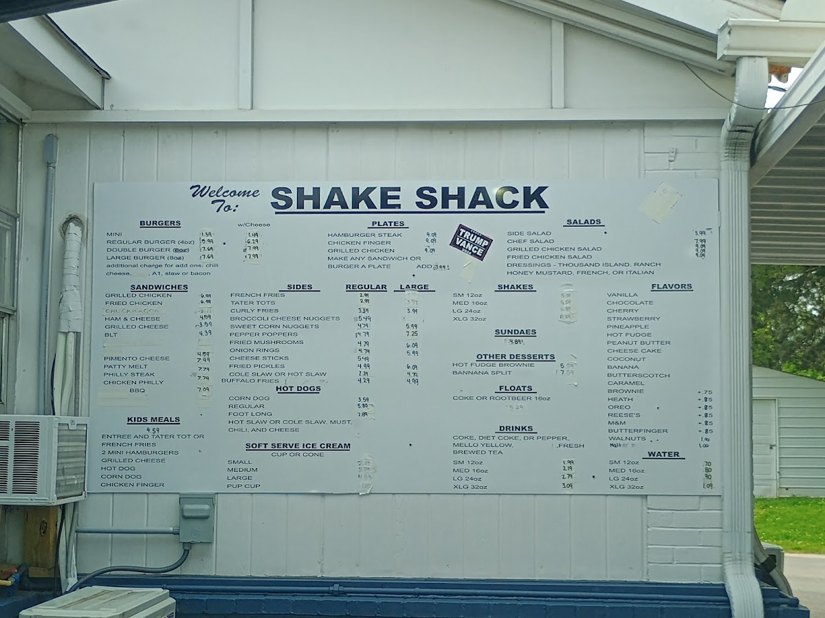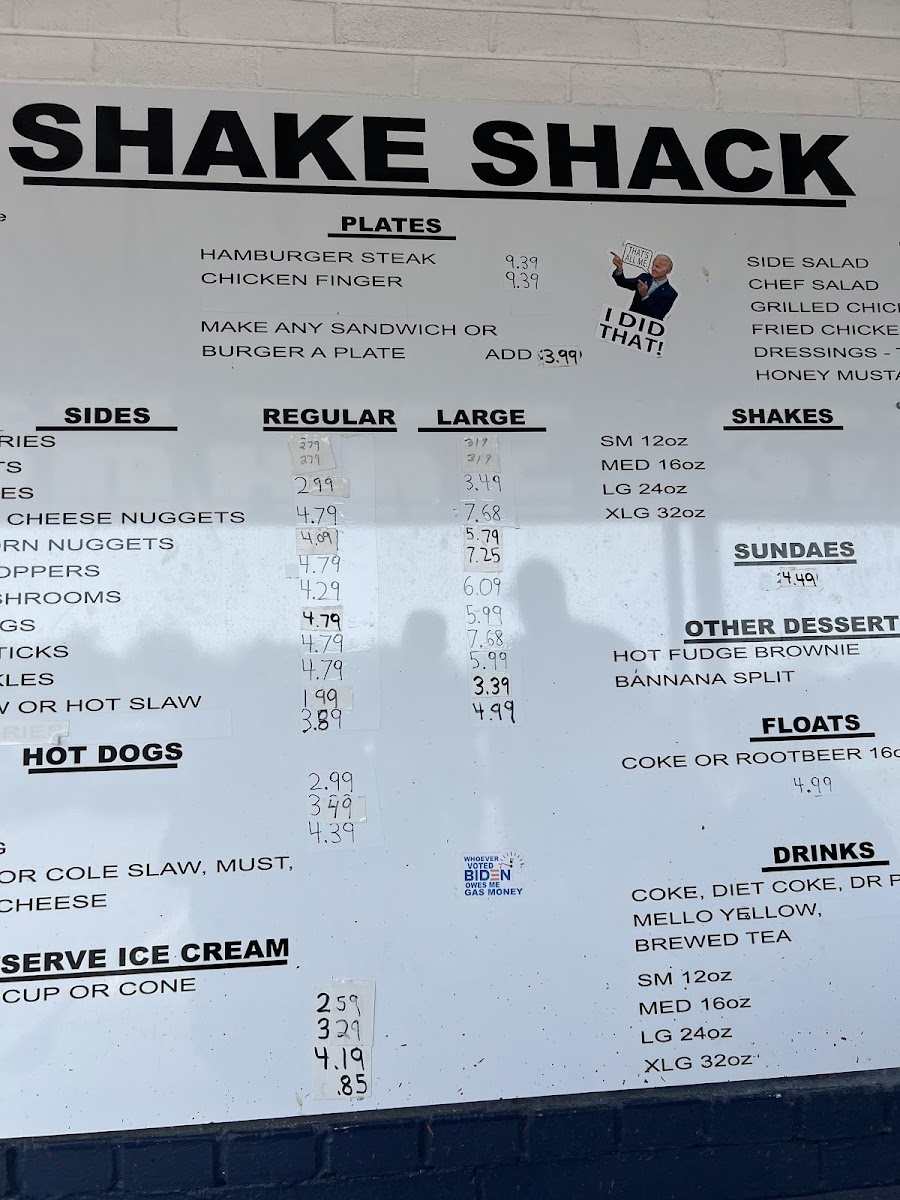 The menu offers a variety of options primarily centered around hamburger and fast food items, complemented by ice cream treats. Food selections include classic and specialty burgers such as cheeseburgers and the Texas Toast BLT Pimento Cheese Burger, along with sides like tater tots and fries. Sandwich options also include a fish sandwich.